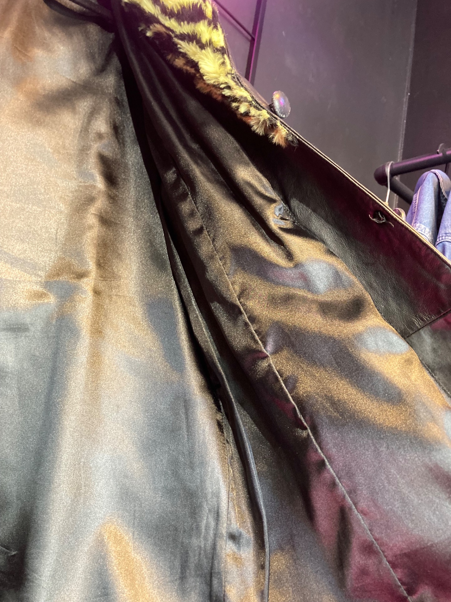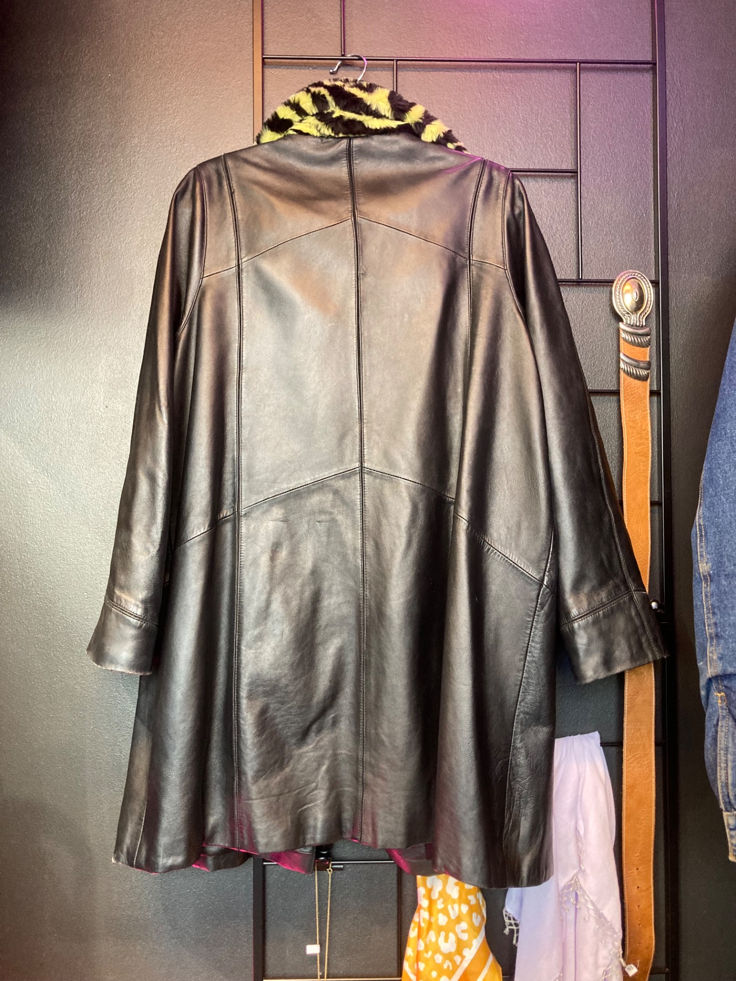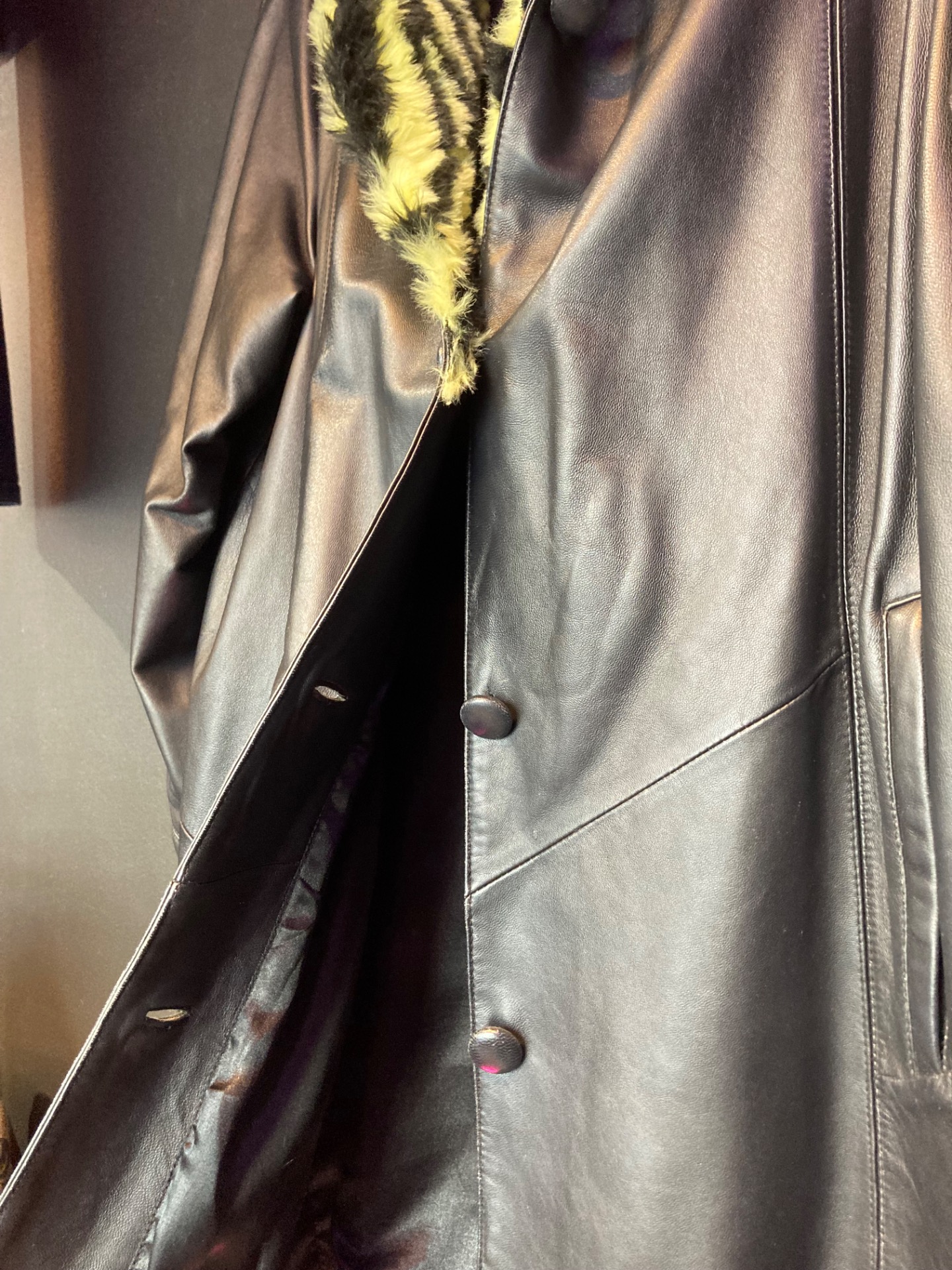 Saki pitkä musta nahkatakki karvakauluksella