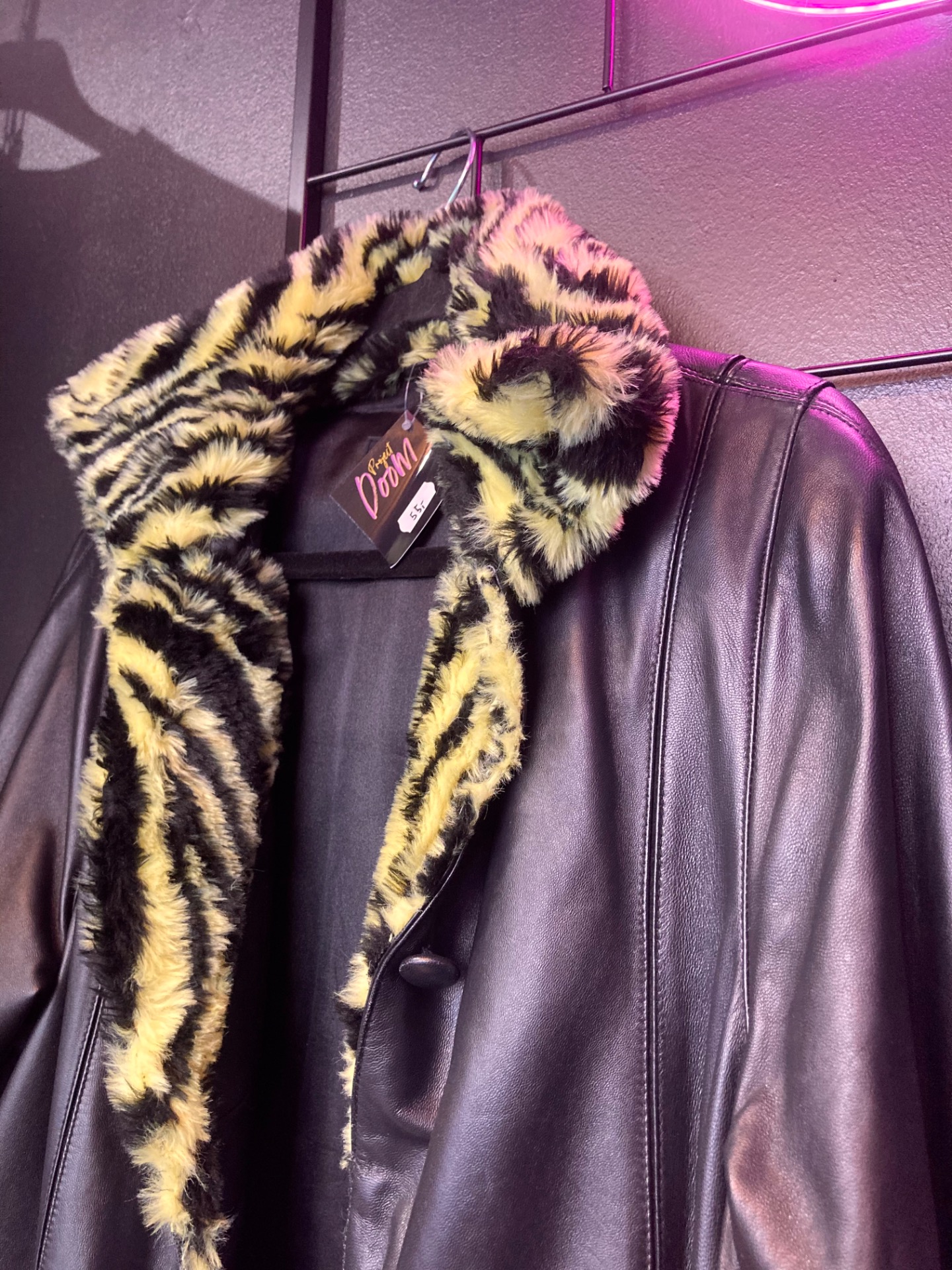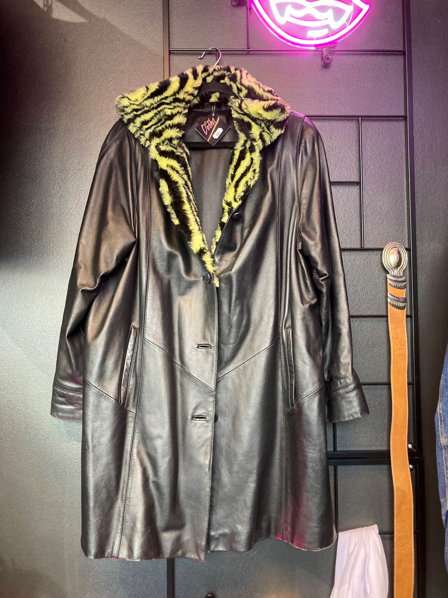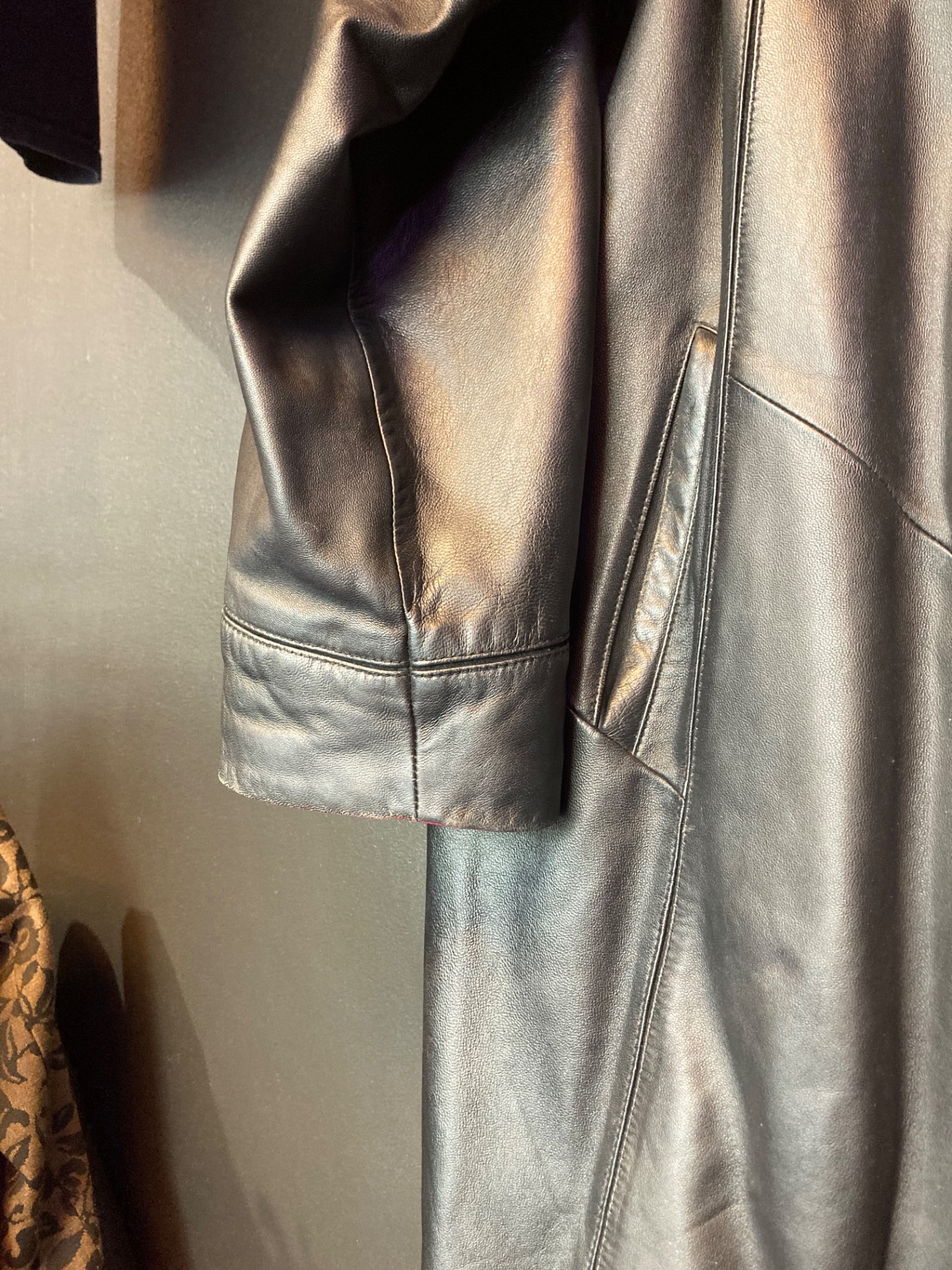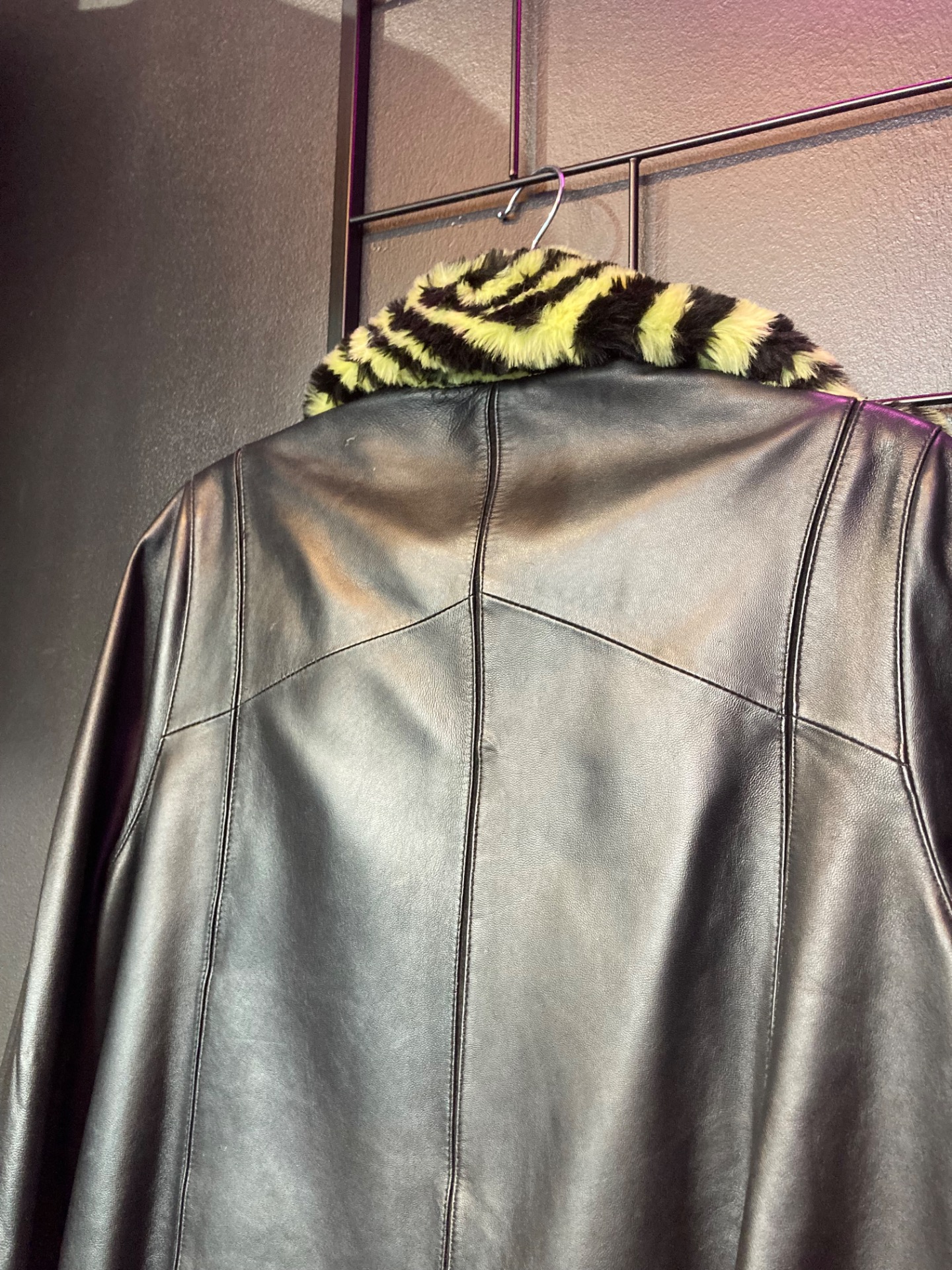 Saki pitkä musta nahkatakki karvakauluksella